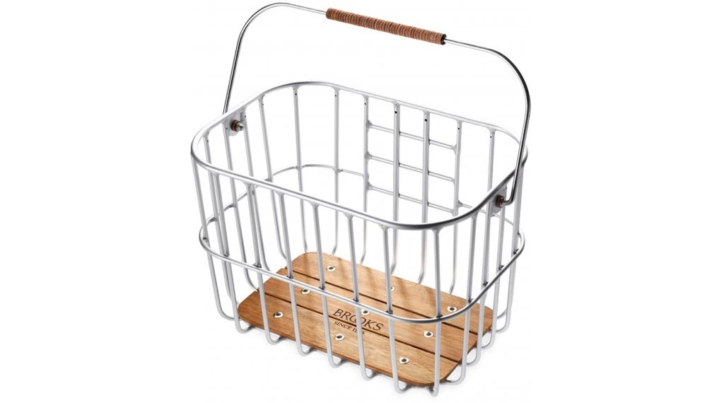 Der Hoxton-Korb ist ein Fahrradkorb aus einer leichten Aluminiumstruktur, einem Iroko-Holzboden und einem Ledergriff aus echtem Brooks-Leder, das aus der Brooks Sattelproduktion stammt.